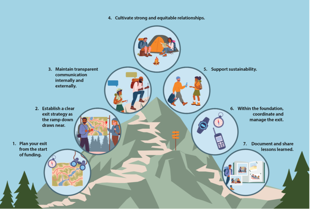 Just as a hiker needs a clear path, funders should develop a thoughtful exit plan that includes a timeline and remains flexible. Careful preparation helps minimize disruptions to the field and grant partners after our departure. We should anticipate disparate impacts for grant partners based on various circumstances — budget size, financial situation, support or lack thereof from other funders — and proactively develop appropriate mitigation strategies in service of equity in our exit plans.